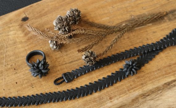 革を立体的にカットしてゆき、磨き、箔を貼り、成形し、縫い合わせてつくる【forest flower […]